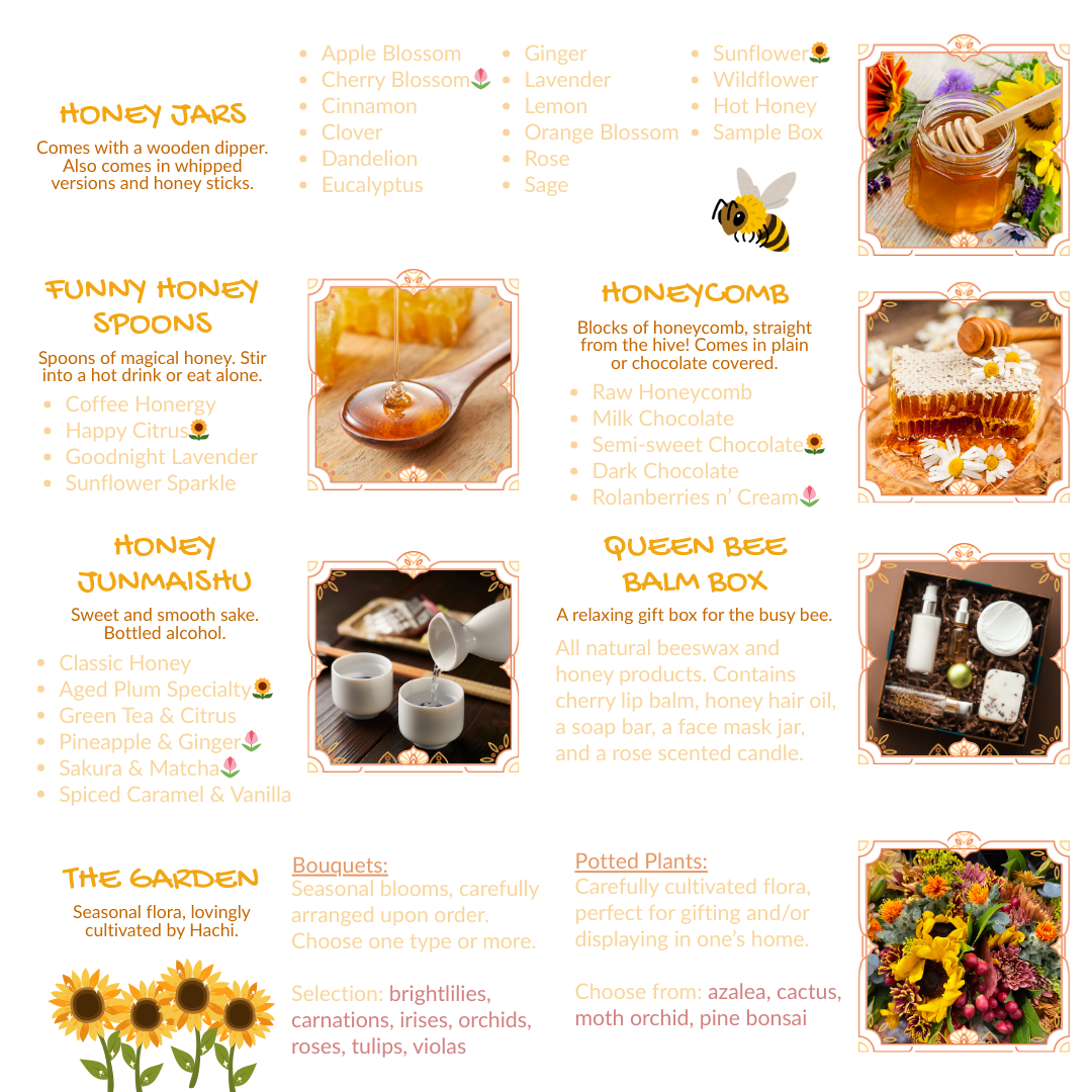 Welcome to Hachi's Honeypot! A shop where you can find premium, locally sourced honey and bee products, along with seasonal flora. Sourced from where exactly? A lady has her secrets! And if she has extra bee products then all the better.